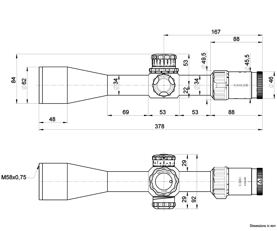 Запатентованная Kahles отстройка параллакса на барабане вертикальных поправок позволяет чрезвычайно быстро делать необходимые настройки как праворуким, так и леворуким стрелкам. Увеличенный индикатор сделанных щелчков облегчает ввод поправок из стрелковой позиции и их контроль.
