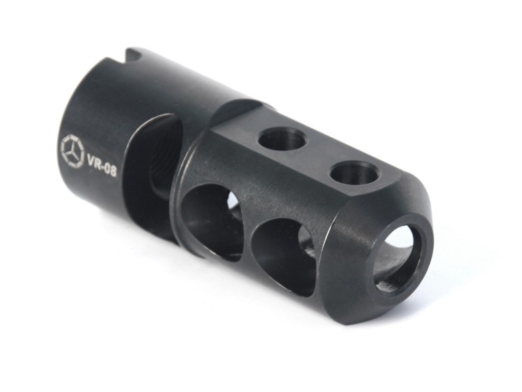 Имеет одну активную и две реактивные камеры, благодаря чему достигается снижение отдачи, а два компенсаторных отверстия обеспечивают снижение подброса ствола. В VR-08 (в отличие от VR-08T) отсутствует первая перегородка. Это изменение исключает прорыв газов за резьбу. Также преимуществом ДТК является возможность чистки ствола не снимая устройство, так как первая камера начинается на одном уровне с торцом ствола.
