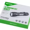 Охотничий набор T5 - это набор, включающий тактический фонарь T5 дальнего действия яркостью 760 люмен, крепление на оружие (RM85S), дистанционное кнопку (TS3-L) и 2 батареи CR123A Благодаря большой дальности луча среди фонариков одинакового размера, T5 может помочь вам быстро обнаружить дичь или заметить опасность. Кроме того, T5 оснащен удобной выносной кнопкой включения.