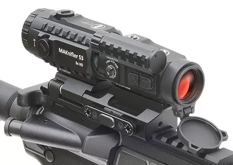 Комплект увеличительная насадка MAKnifer S3 и коллиматорный прицел MAKdot S 1x20 на едином основании MAKmasterLock CS образует цельный единый комплекс для установки на оружие, адаптированное планкой weaver/picatinny. Кронштейн имеет 2 посадочных места. Спереди комплекса на свое посадочное место монтируется коллиматорный прицел, сзади прицела монтируется увеличительная насадка. Увеличительная насадка монтируется на откидную площадку, что позволяет вести прицеливание как непосредственно через коллиматорный прицел с откинутой вбок насадкой, так и через насадку при возвращении ее на место за прицелом.
