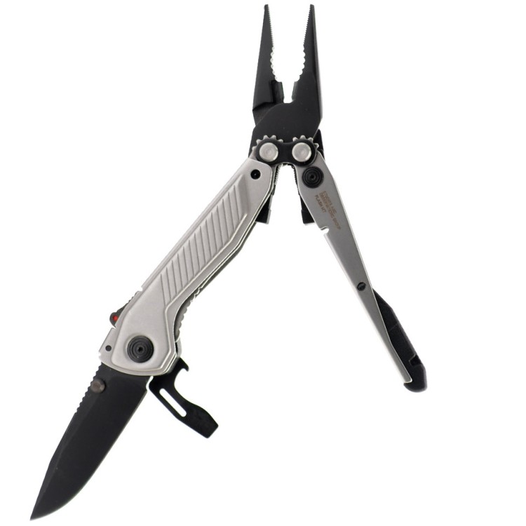 В состав мультитула входит ножевой откидной клинок из этой стали, которая долго держит заточку режущей кромки и делает рез клинка более агрессивным. Клинок из этой стали обладает высокой ударной вязкостью и выносливостью к нагрузкам, снабжен механизмом полуавтоматического открытия и предохранителем. Длина клинка: 61 мм, толщина: 3мм. Длина в закрытом виде: 86 мм.
