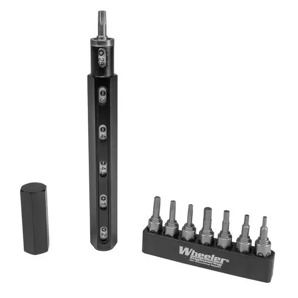 Набор бит с алюминиевой ручкой Multi-Driver Tool Pen with Aluminum Handle от бренда Wheeler – один из таких наборов. Разработанные для профессионального оружейника и опытного пользователя, инструменты набора отличаются исключительно высокой практичностью , высококачественные материалы обеспечивают реальную надежность и долговечность, - их качество гарантировано на всю жизнь. Компактной формы, удобно помещающийся в руке, этот держатель – контейнер битов, по размерам и форме напоминающий карандаш и выполненный из алюминия, удерживает шесть наиболее часто используемых бит внутри алюминиевого контейнера.