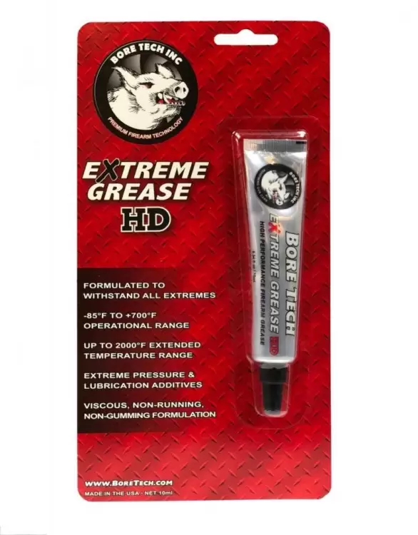 Bore Tech EXTREME GREASE используется для обработки боевых упоров, затворов и прочих узлов, обеспечивая их надежное функционирование, продлевая срок службы и повышая эффективность в самых суровых условиях.
