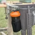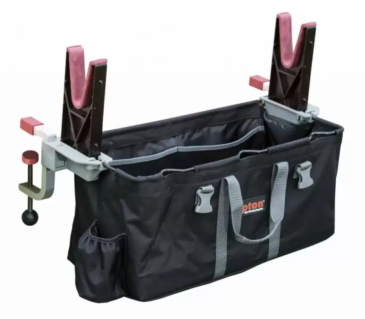 Станок – сумка представляет собой мобильный комплект передней и задней опор для чистки оружия, переносимых в большой походной сумке. Обе опоры базируются на достаточно мощных резьбовых струбцинах, привинчиваемых перед чисткой оружия к любой внешней столешнице на необходимом для установки оружия расстоянии. В верхние полки каждой струбцины, содержащих специальные окна, устанавливаются съемные вертикальные стойки опор. Таким образом, реальной связывающей силовой базой опор служит внешняя столешница с прикрепленными к ней струбцинами и вставленными стойками. Когда оружие для чистки вставляют в обе опоры, система готова. Сумка, в которой переносились струбцины и стойки, силовой нагрузки в процессе чистки не несет. В комплект поставки входит встроенный держатель для напитков, в самой сумке предусмотрены 3 кармана для переноски содержимого, в том числе элементов оружия, но в ней могут находиться и аксессуары, необходимые для чистки.