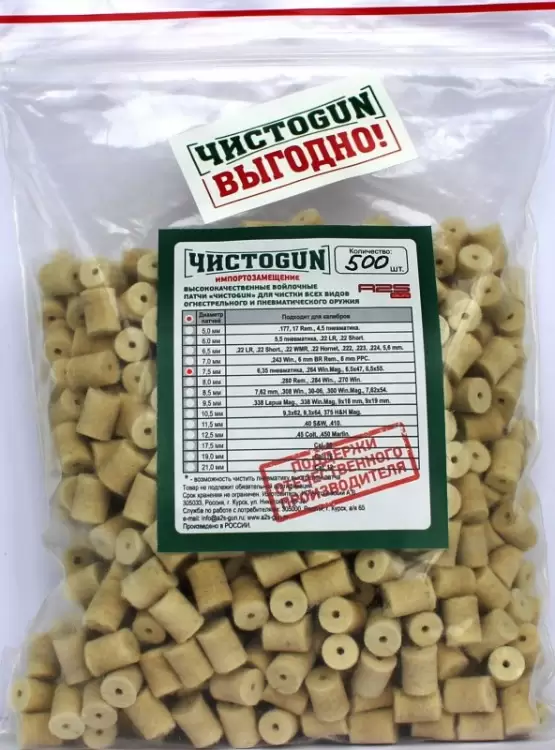 Войлочные патчи ЧИСТОGUN, 6,35 пневматика, .264 Win.Mag., 6,5х47, 6,5х55., диаметр 7,5 мм, 500 шт. Высококачественные войлочные патчи, для чистки всех видов огнестрельного и пневматического оружия.